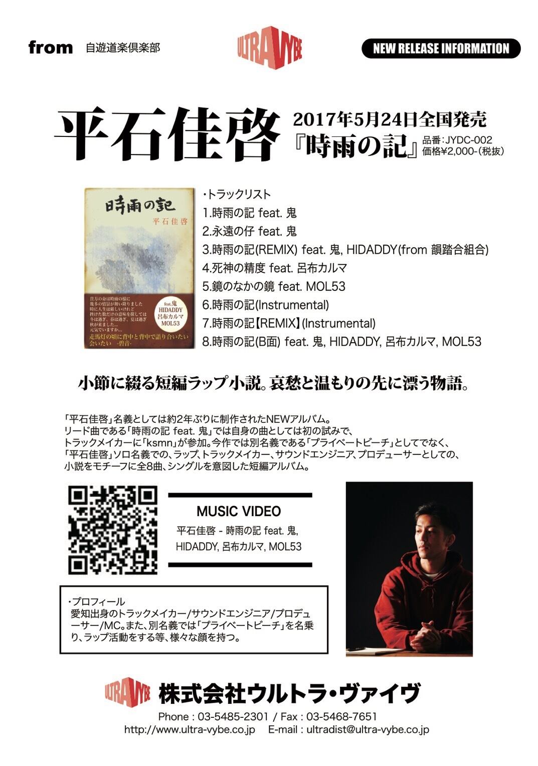 「平石佳啓」名義としては約2年ぶりに制作されたNEWアルバム。リード曲である”時雨の記”では自身の曲としては初の試みで、トラックメイカーに「ksmn」が参加。今作では「プライベートビーチ」としてでなく、「平石佳啓」ソロ名義での、ラップ、トラックメイカー、サウンドエンジニア、プロデューサーとしての、小説をモチーフに全8曲、シングルを意図した短編アルバム。
